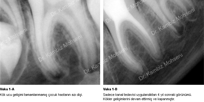Altı yaşında sürekli birinci büyük azılar sürmeye başlar. Yeterli temizlik ve hijyen sağlanmadığı zaman bu dişler hızla çürüyebilir. Dolgu yapılmazsa ve çürük pulpaya ulaşırsa kanal tedavisi gerekir. Dişin kökü bazen gelişimini tamamlamamış ve açık kalmış olabilir. Bu durumlarda apeksifikasyon tedavisi uygulamak gerekebilir. Çocuğun uyumlu olması tedavinin başarısını etkileyen en önemli kriterdir. Bazen travma nedeni ile dişler kırılır ve pulpa açığa çıkar. Bu tür durumlarda da çocuklara kanal tedavisi yapılması gerekebilir. Süt dişleriyle ilgili tedaviler genellikle pedodontistler (çocuk dişi uzmanı) tarafından yapılır. Vaka 1-A ve 1-B.
